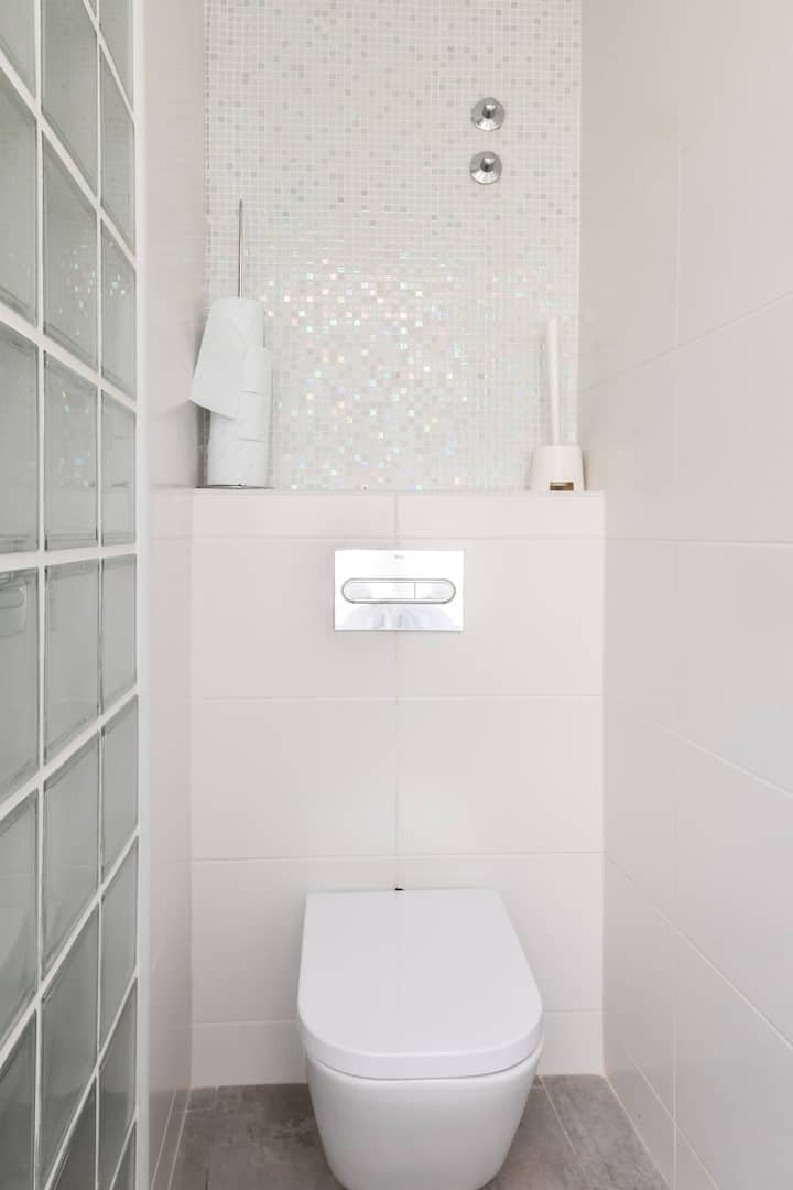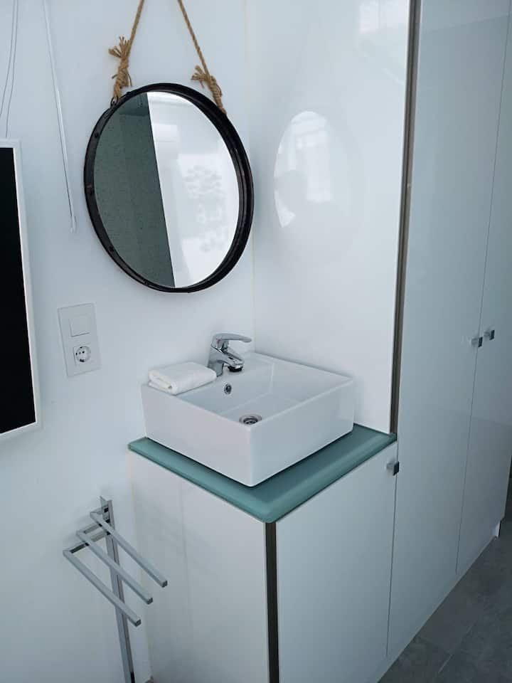 The whole home is accessible to guests. The ground floor has a kitchen and small shower room which serves those staying on the very comfortable sofa bed on the floor above. The living room with smart TV contains the sofa bed. The next two floors contain the two ensuite bedrooms both with smart TV, one with a glass roof(with automatic blind) to look at the stars at night. On the attic floor is a small toilet, and laundry facilities and a little chill out zone.